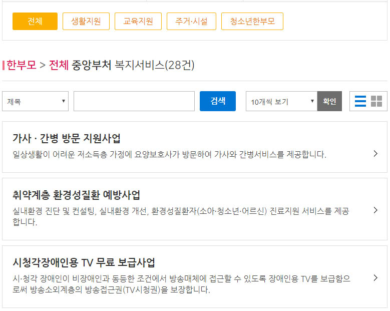 한부모가족에 대해서는 총 28건의 서비스가 있으며, 생활, 교육, 주거, 시설, 청소년 한부모등 제공되는 복지 혜택을 자세히 확인할 수 있습니다.