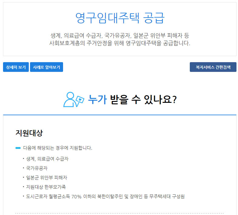 여러가지 서비스중에서 주거안정을 위한 영구임대주택 공급 내용을 보시면 아래와 같습니다.