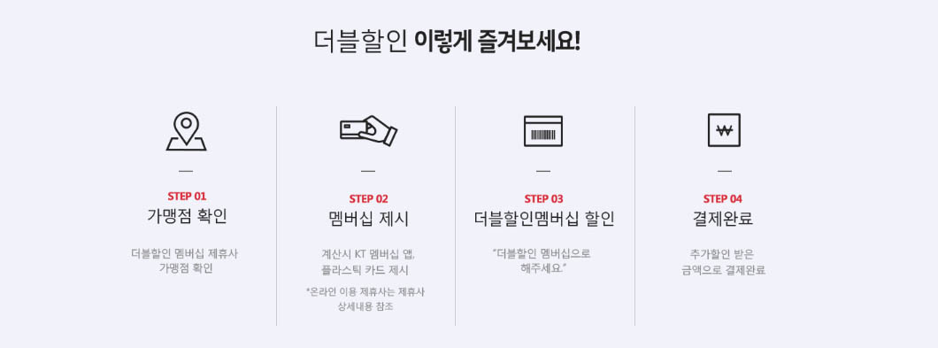 KT에서는 멤버십 모든 고객들에게 더블할인이라 하여 2배 할인혜택을 제공하고 있는데요. 할인률이 큰 만큼 월 1회만 받을 수 있습니다.