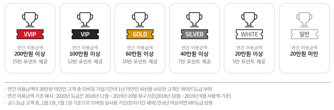 매년 1월 1일부터 새로운 등급 및 포인트가 적용되며, VVIP 등급 요금제로는 슈퍼플랜 프리미엄 플러스, 슈퍼플랜 스페셜 플러스, 슈퍼플랜 스페셜, Y슈퍼플랜 스페셜이 있습니다.
