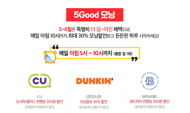 또한 5Good 모닝이라 하여, 매일 아침 10시까지 CU편의점, 던킨도넛, 파리바게뜨에서 최대 30%까지 할인 받을 수 있습니다. 바쁜 직장인들의 아침을 지원해주는 듯하여 기분 좋네요. 저도 아침을 먹는 편은 아니지만 출근전에 출출할 때 파리바게트에 들려서 샌드위치를 살 때 kt멤버쉽 포인트로 할인 받고 있답니다.