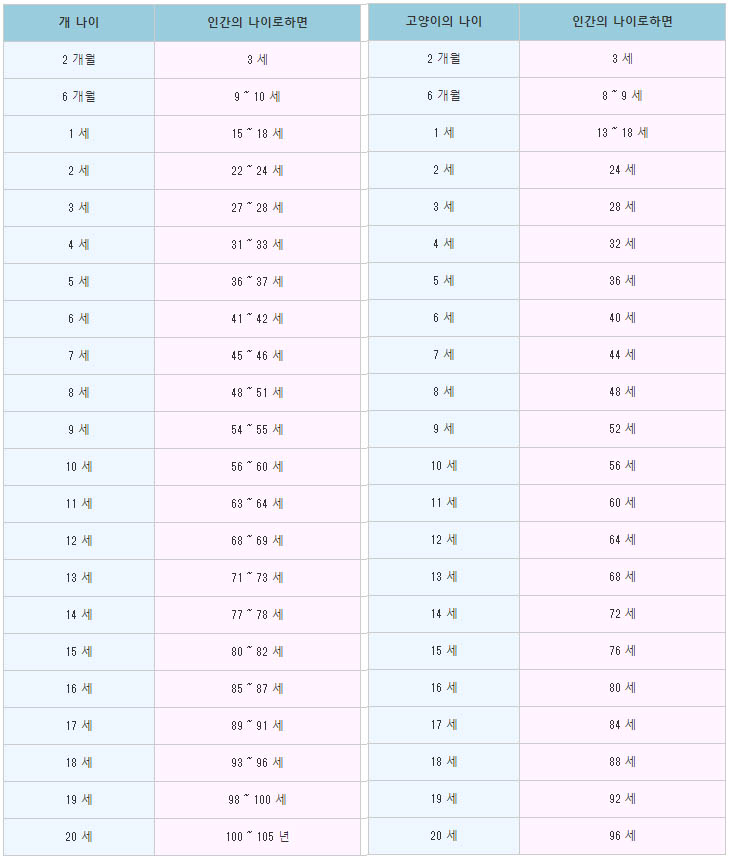 강아지는 사람보다 빠른 속도로 나이를 먹고 성장합니다. 강아지의 나이를 사람으로 환산하면 아래 표와 같습니다.